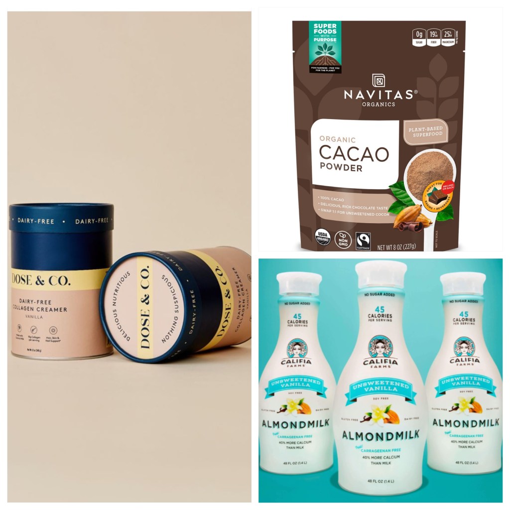 Who doesn’t love a delicious chocolate smoothie? Now what if we amped up the protein you get and throw in some collagen powder? This one calls for a scoop of Dose & Co Collagen Creamer, Califia Unsweetened Vanilla Almond Milk, and a scoop of Navitas Cacao powder. The combination of these gets you some protein, collagen, and is great on the go and to help with any chocolate cravings. If you are ok adding in a little extra carbs, try a few strawberries or half a banana to make it a little more fruit flavored.