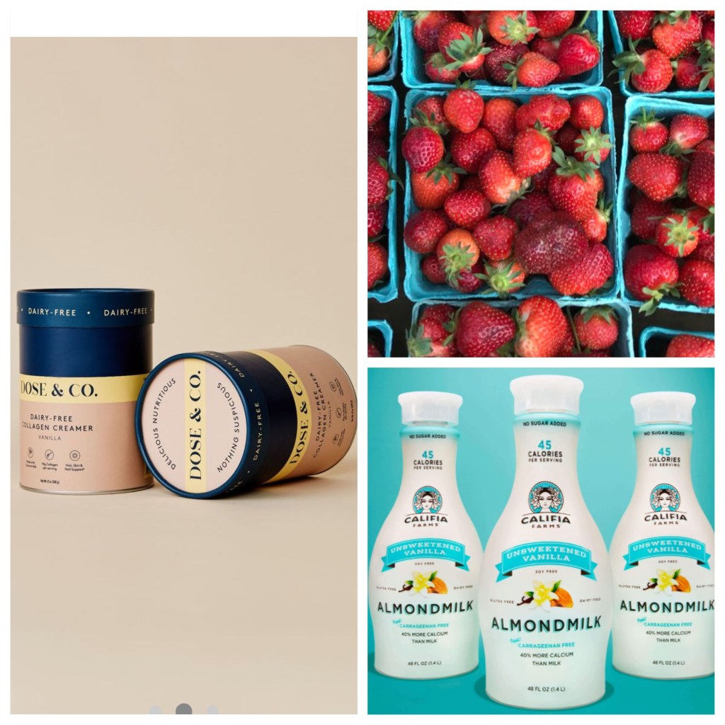 If you are looking for a low carb fruit version of a smoothie try 4 strawberries, a scoop of Dose & Co, with Califia Unsweetened Vanilla Almond Milk. Toss into your blender (I invested in a Vitamix a few years ago and swear by it for smoothies, soups, and dressings).
