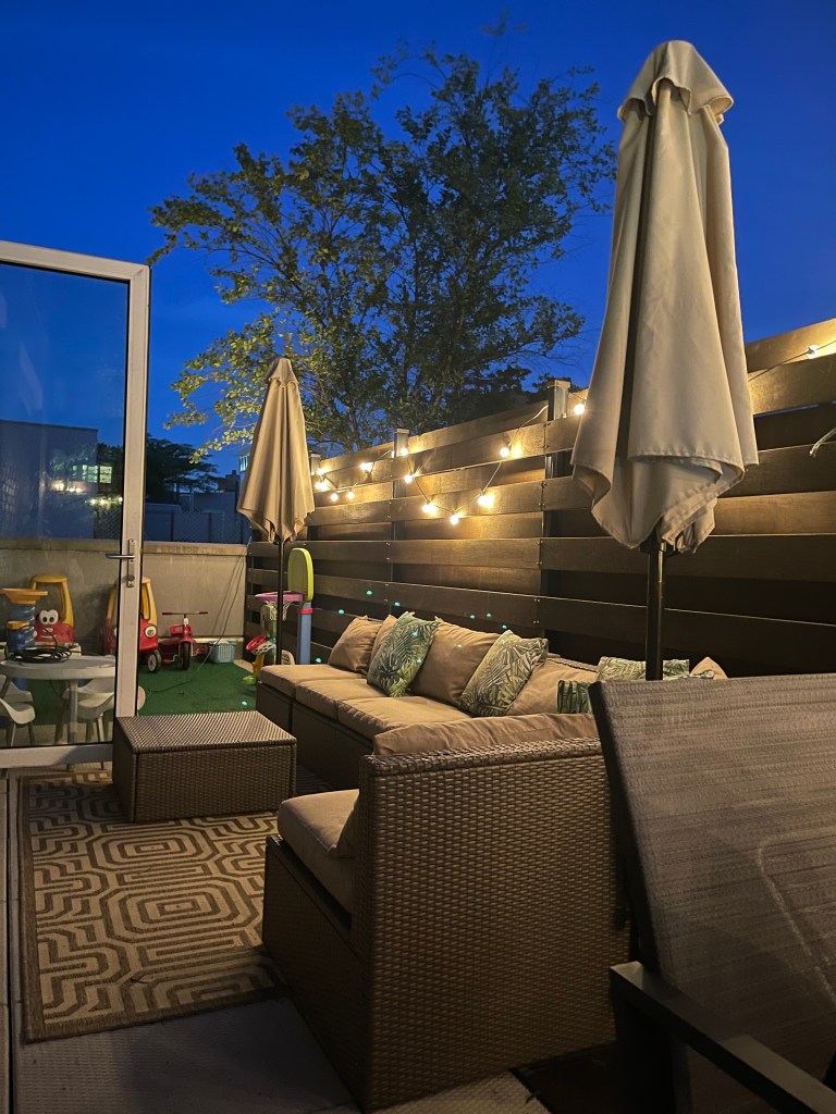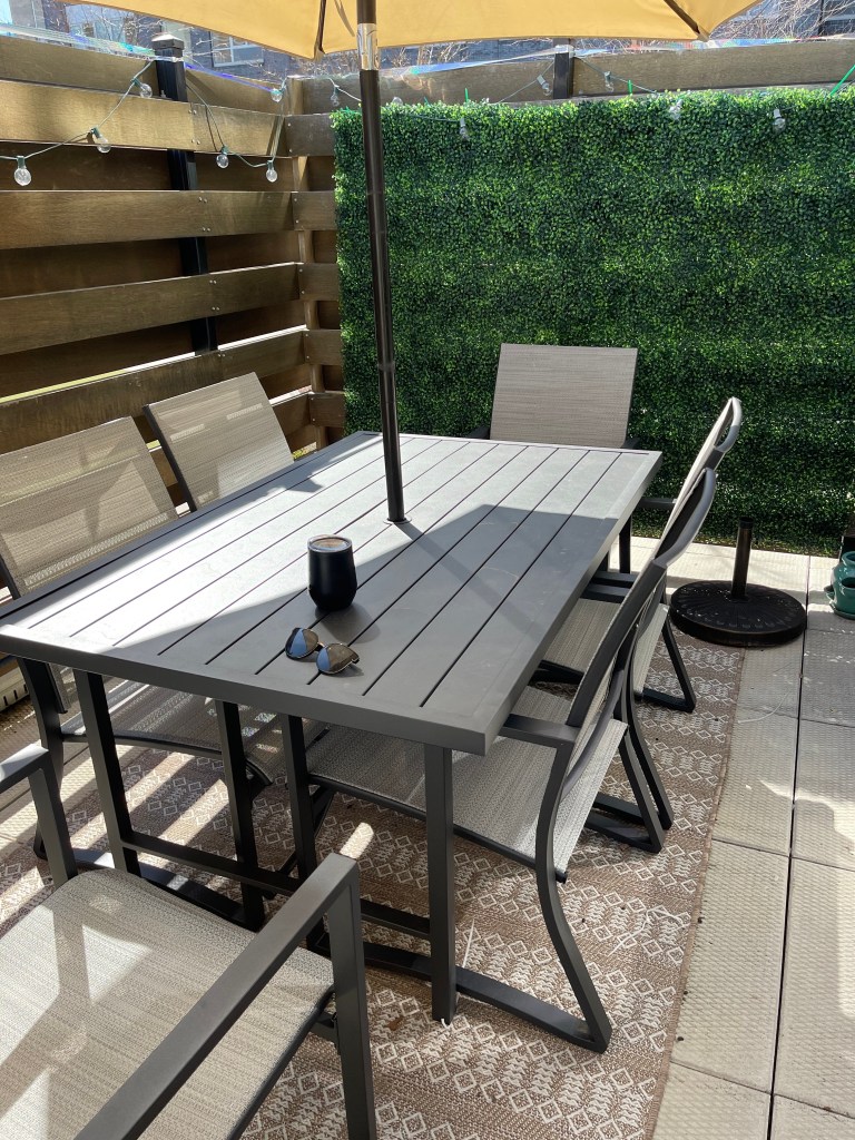 Our outdoor project started last Summer during the pandemic when it became clear we were going no where fast. With three kids all under 4 at that time we started slowly to replace items and envision a space for our family. We wanted to create three sections of our rather large Brooklyn terrace. The first area would be our outdoor dining section. We spent so much time looking at tables and chairs and agreed the most important thing to us was to have something that could fit our family of 5 and to be durable for NY Winters.