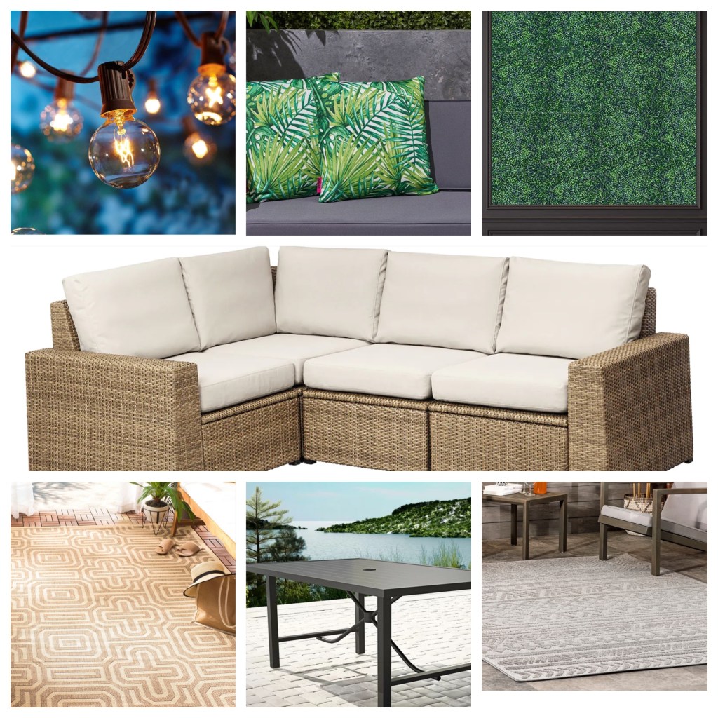 Here are links to most of the products or similar for what we got (at this time the dining table/chairs are out of stock)- also huge tip: Purchase extra lightbulbs for any outdoor lights! They don’t break easily but they do break and after the clean up comes the replacement of them so it is easier to have a box of extras on hand for this.